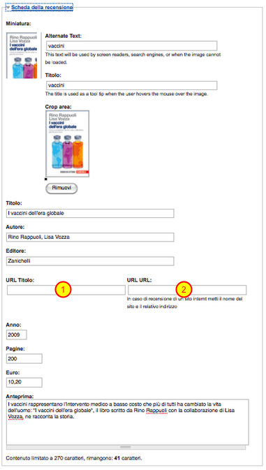 Ho pensato che trattavamo male le recensioni, libri o siti che fossero. Ecco quello che ho fatto. Una miniatura: questa la vedranno anche gli unteti nella pagina, non solo in Home page. E poi i classici campi di una biblioteca. Titolo, autore, editore, anno, pagina, euro.
