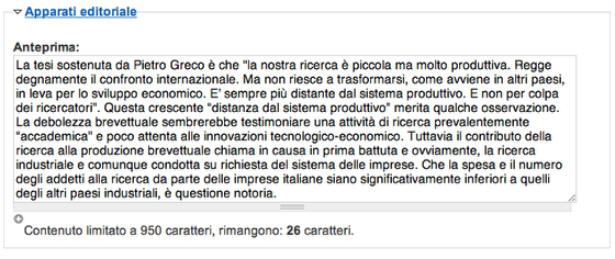 L'editoriale è un articolo particolare, la cui anteprima Creare tipo di contenuto "Articolo" e compilare gli apparati dell'articolo, con anteprima e miniatura